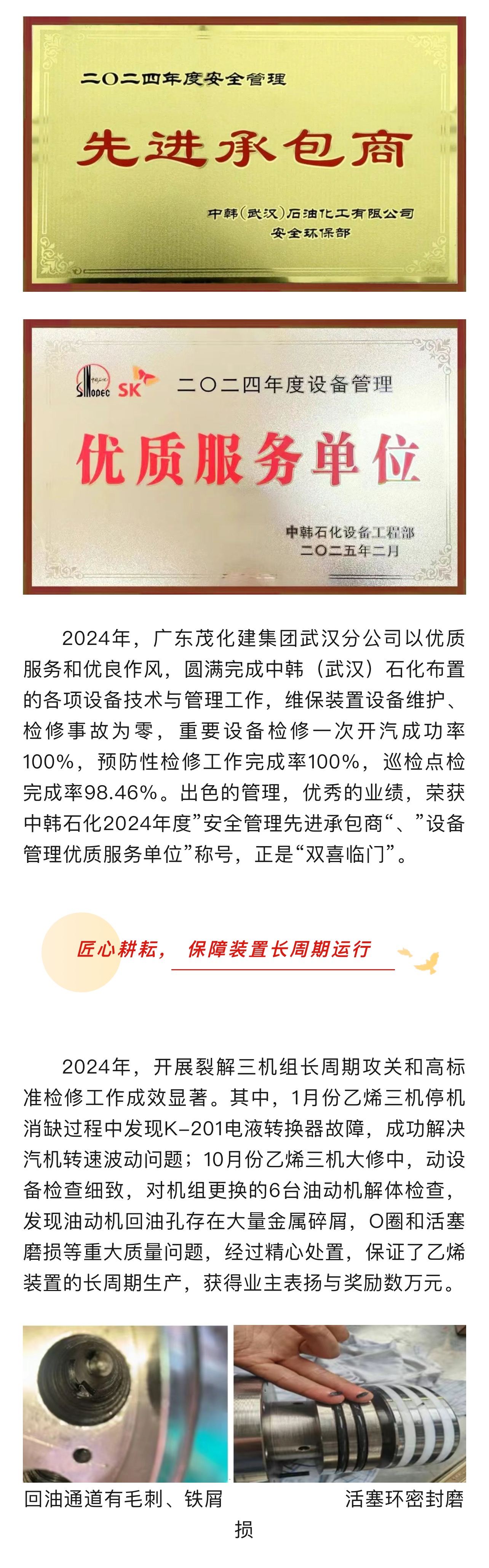 雙喜臨門 | 武漢分公司榮獲2024年度中韓石化“安全管理先進承包商”、“設(shè)備管